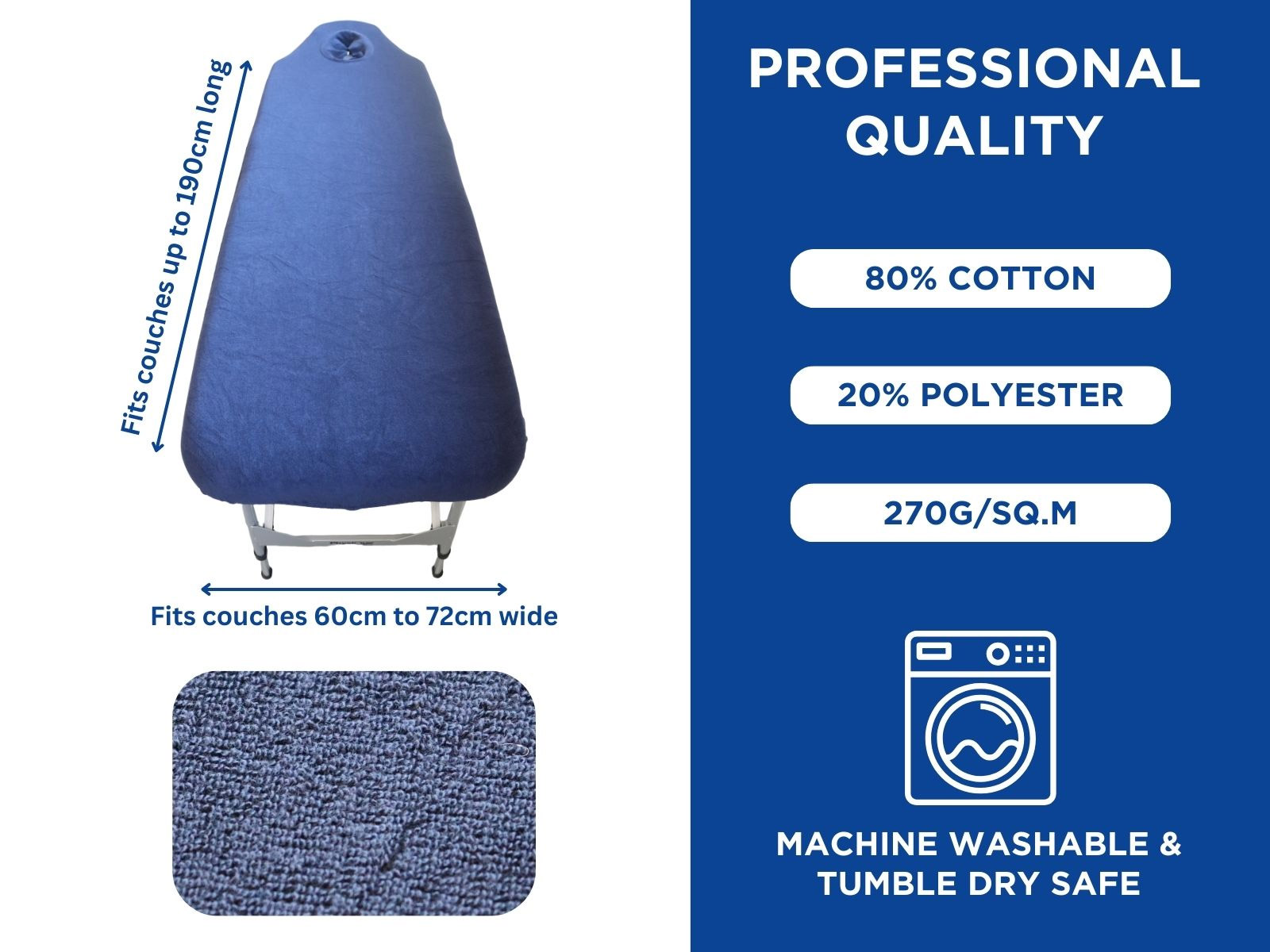 Made from a high-quality cotton-based stretch fabric with an impressive 270 GSM thickness, the Physique couch cover offers superior comfort and durability. The thick material provides excellent protection for your table while maintaining a soft, professional feel for clients during massages, facials, and body treatments.
