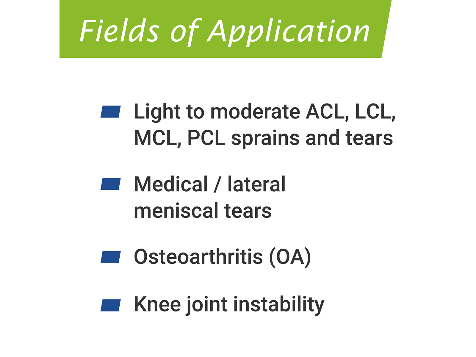 - Light to moderate ACL, LCL, MCL, PCL sprains and tears