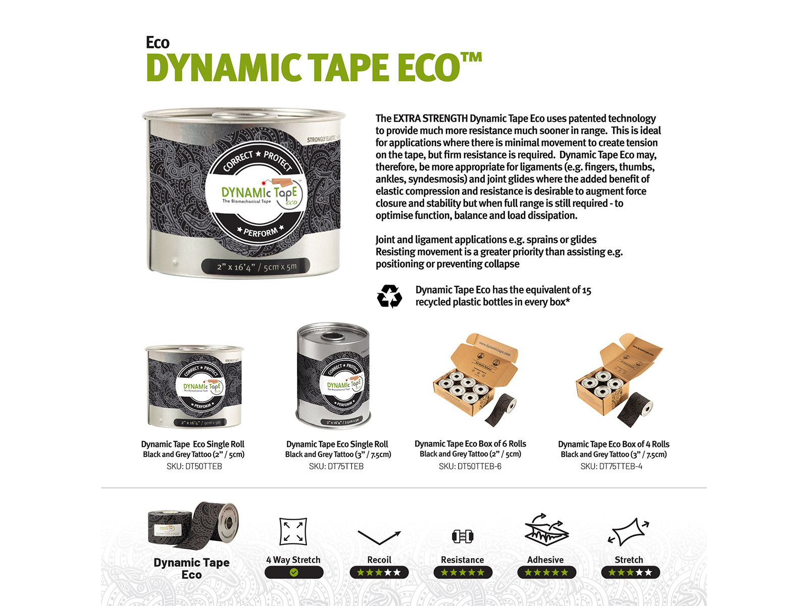 The Dynamic tapes in 50 and 75mm in both original and ECO, have significantly helped me in rehabilitation of a very weak calf muscle (cause by nerve damage after a disc herination early 2021).