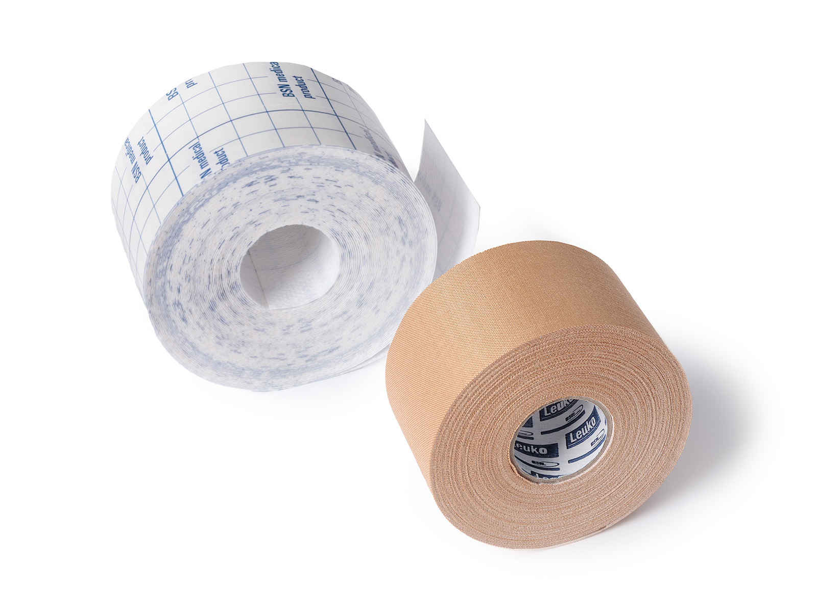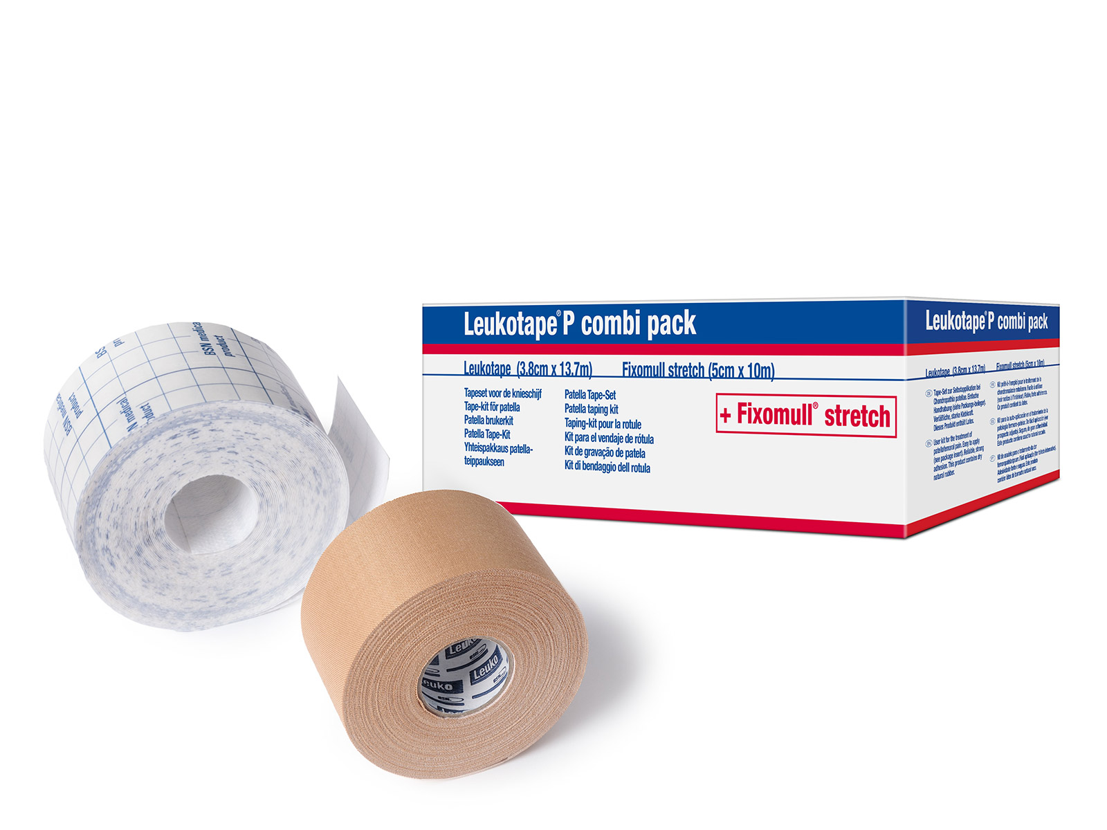 The Leukotape® P Combi Pack comprises of a roll of 3.8cm x 13.7m Leukotape® P along with a roll of 5cm x 10m Fixomull® stretch for use as a protective underwrap.